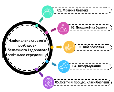 Рішення на державному рівні визначають безпеку освіти одним із ключових пріоритетів. Національна стратегія розбудови безпечного і здорового освітнього середовища передбачає комплекс заходів для закладів освіти, і реалізується за ключовими напрямами: