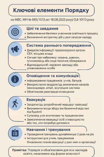 Основним документом, що врегульовує діяльність закладів освіти за цим напрямом, є наказ МВС, МОН № 685/1013 від 18.08.2023 року «Про затвердження Порядку раннього попередження та евакуації учасників освітнього процесу в разі нападу або ризику нападу на заклад освіти», де визначено механізм реагування поліції, ДСНС, закладів освіти щодо раннього попередження та евакуації учасників освітнього процесу в разі нападу або ризику нападу на заклад освіти.